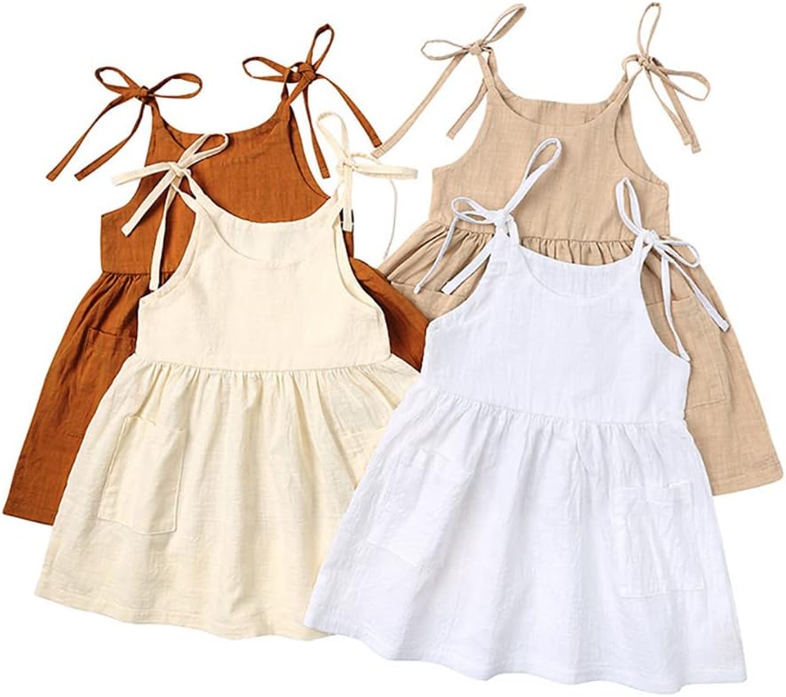 Toddler Baby Girl Summer Cotton Linen White Dresses Bow Straps Sleeveless with Pockets Casual Sundress